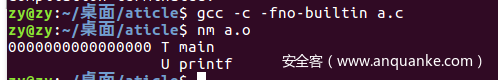 Tip:编译的时候加上-fno-builtin参数,否则gcc会进行优化,因为printf()函数只有一个参数会被优化为puts()来提高效率。