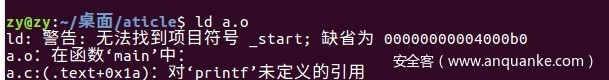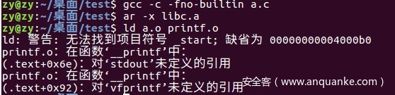 接着将静态库(之后有详细介绍)lbc.a解压至当前目录,再次尝试链接,发现链接再次失败。因为在printf.o中存在两个未定义的符号,”stdout””vfprintf”。说明”printf.o”依赖于其他目标文件。