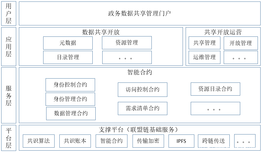 一般采用联盟区块链技术结合私有链,针对政务数据共享开放的不同使用场景,解决共享开放中参与者身份认证、用户隐私保护、访问控制、数据传输加密、智能合约管理、操作追溯审计等问题。主要包括基础平台、服务层和应用层等,框架见下图。【1】