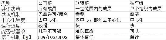 区块链由多方维护,采用多种密码技术保证传输和访问安全以适应不同场景需求,采用哈希指针连接以有效地防篡改。区块链可靠地记录、同步、共享、验证交易和数据,在电子政务复杂的业务环境中,有助于便捷地建立部门间信任关系。实现城市范围内甚至更大范围跨空间、跨时间多主体高效协作。经过发展,区块链技术可以分为公有链、联盟链和私有链【4】,如下表所示: