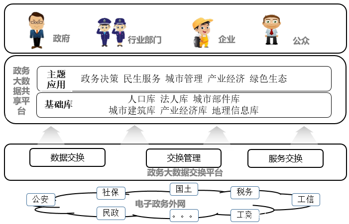 城市内各政务部门通过集中统一的城市大数据共享平台实现数据的采集、交换、存储、清洗、整合、共享、开放,为各政务部门以及社会提供统一的政务服务。各政务部门依托电子政务网络和共享交换平台维护、更新共享政务数据信息到集中统一的政务大数据平台,最终实现政务数据共享。