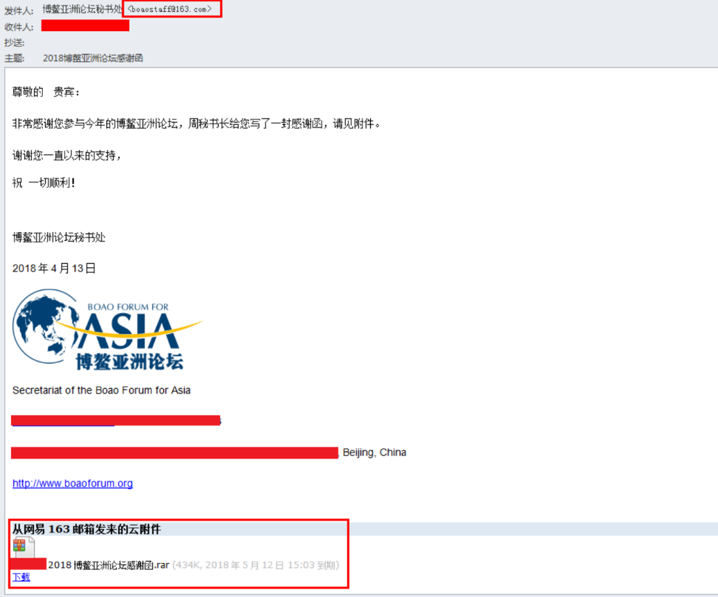 2018年4月,我们捕获到了一次核危机行动的最新攻击活动。某些重要的政府和企业机构的邮箱用户收到一份发自boaostaff[@]163.com的鱼叉邮件,鱼叉邮件仿冒博鳌亚洲论坛主办方向受害者发送了一封邀请函: