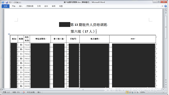 当受害者点击打开这个伪装成Word文档的专用木马后,木马会在释放攻击代码的同时,释放一个真正的Word文档。下图为该诱饵Word文档打开后的信息内容,其中信息确实是一份详细的通讯录。可见,该组织在文件伪装方面确实下足了功夫。