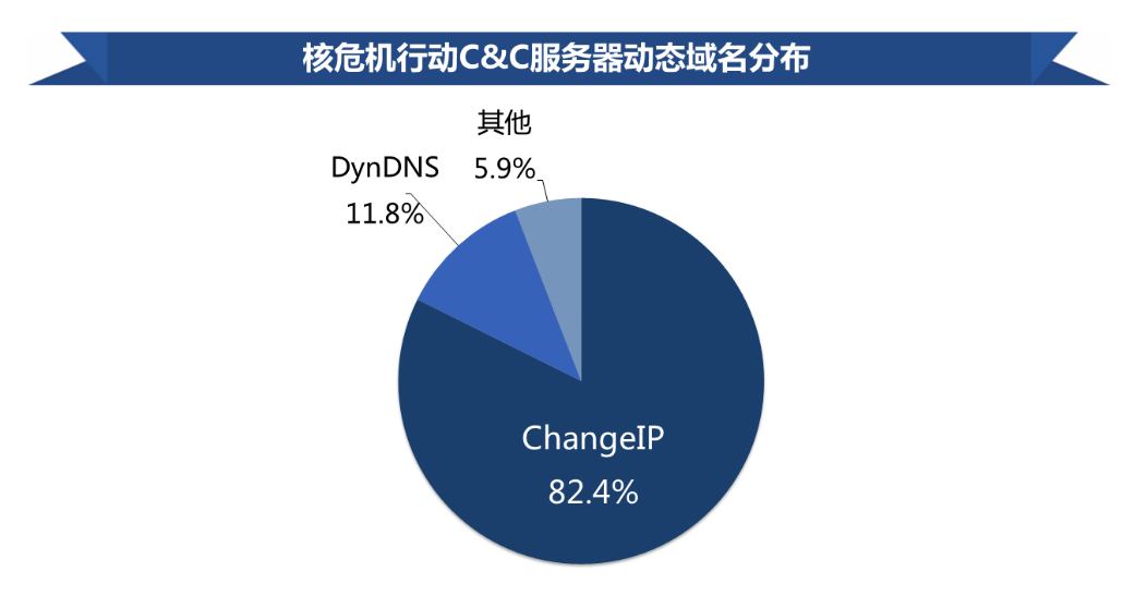 截止2018年5月,360追日团队共截获核危机行动相关C&C服务器动态域名20余个,固定IP地址20余个。在动态域名中,ChangeIP域名占82.4%,DynDNS域名占11.8%,其他占5.9%。