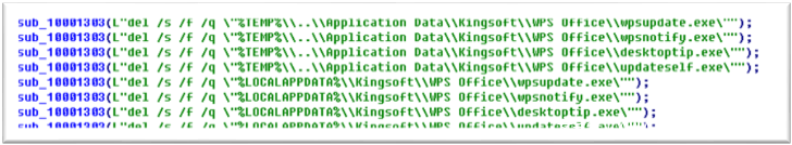 特别的,Bfnet后门会针对WPS程序进行专门攻击。Bfnet执行后会删除TEMP目录和LOCALAPPDATA目录下WPS程序,具体是删除WPS更新程序:wpsupdate.exe、updateself.exe,删除WPS通知程序:desktoptip.exe、wpsnotify.exe。下图是Bfnet删除WPS相关程序代码截图