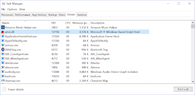 这样一个名为AMSI.DLL的进程就运行了。当Jscript或者VBScript尝试加载AMSI.DLL时,它将获得主可执行文件的句柄,AMSI不再工作。据我所知,这个简短的script并没有被AMSI本身检测到,所以运行你想运行的“真正的”代码是安全的。
