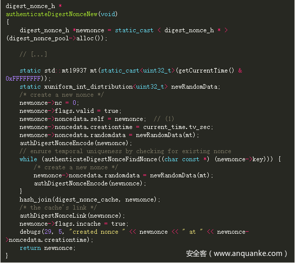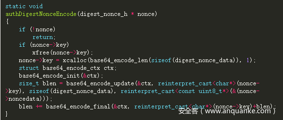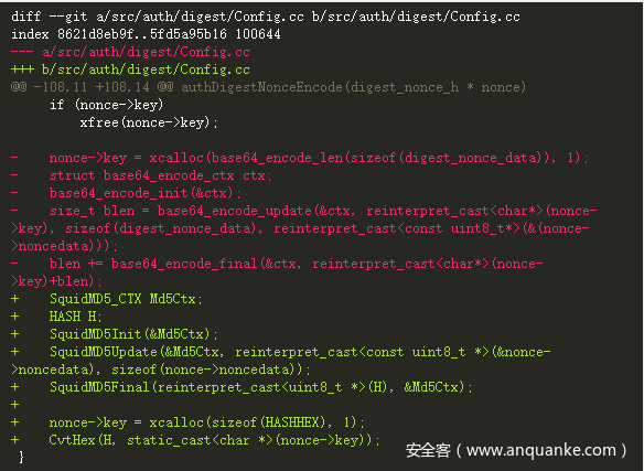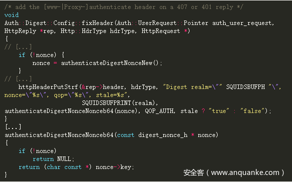 让我们更仔细地看一下Squid中的摘要实现。此nonce由auth/Config.cc中定义的authenticatedigestnoncew函数生成。