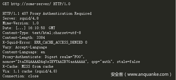 当配置为使用摘要式身份验证方案时,Squid会使用407 Proxy Authentication Required状态代码响应不包含Proxy-Authorization标头的请求。