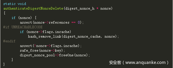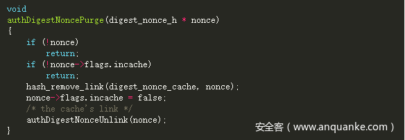 通过跟踪调用authDigestNoncePurge的代码路径,我们可以找到两种从缓存中删除nonce的方法: