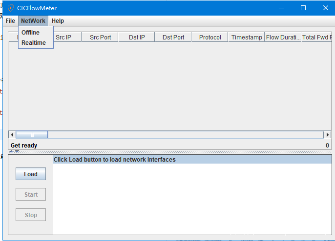 可以选择离线模式和实时模式。离线模式与命令行模式相同,选择pcap包,展示抓取的特征。实时模式则实时抓取流量展示抓取的特征。如图所示: