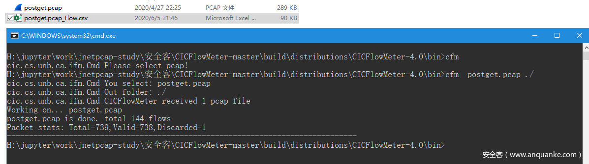 比如这里选择gpostget.pcap, 命令行模式运行就得到postget.pcap_flow.csv