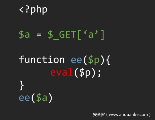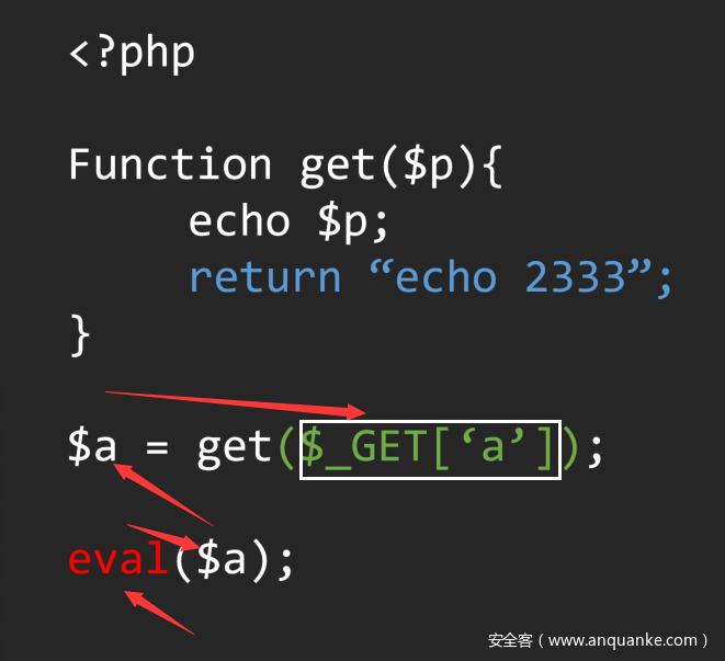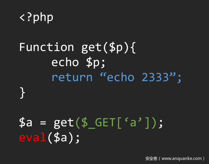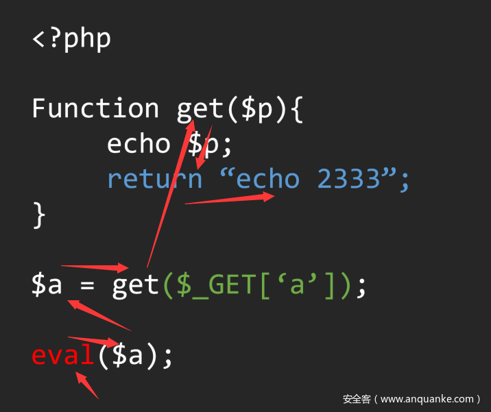 在上面的分析过程中,Sink就是eval函数,source就是$_GET,通过逆向分析Sink的来源,我们成功找到了一条流向Sink的information flow,也就成功发现了这个漏洞。