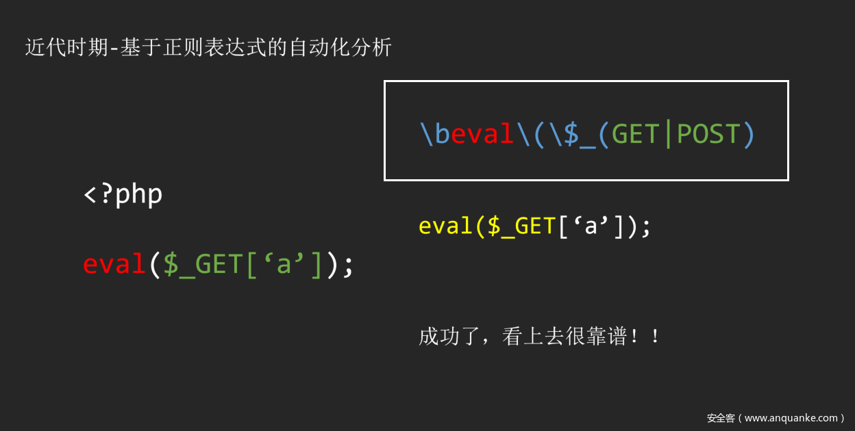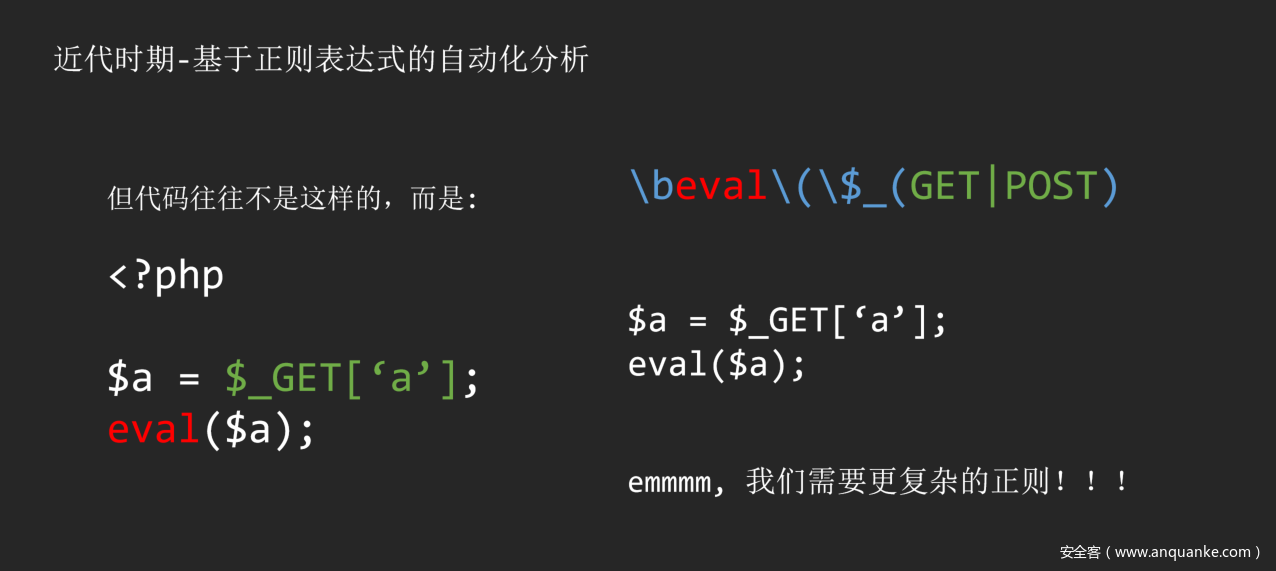 用更多的正则来约束,用更多的规则来覆盖多种情况。这也是早期静态自动化代码审计工具普遍的实现方法。
