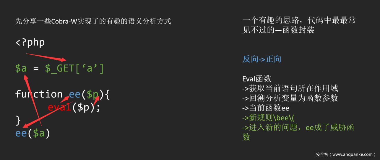 而基于AST的自动化代码审计工具也正是在与这样的问题做博弈,从PHP自动化代码审计中比较知名的Rips、Cobra再到我自己二次开发的Cobra-W.