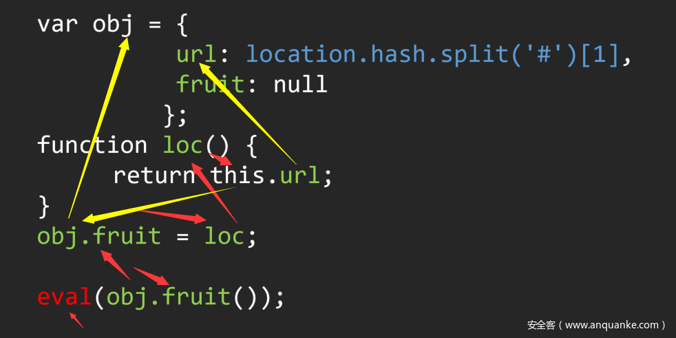 这是一段有漏洞的JS代码,人工的话很容易看出来问题。但是如果通过自动化的方式回溯参数的话就会发现整个流程中涉及到了多种流向。