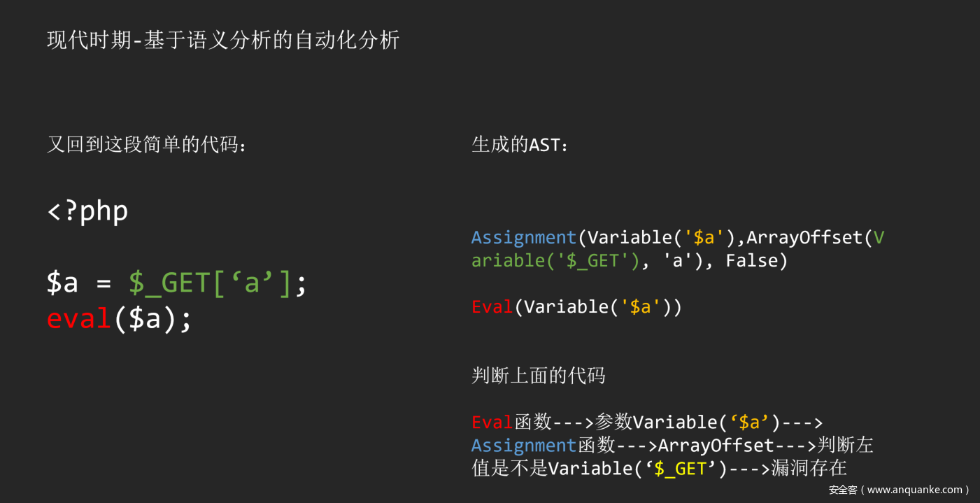 有人忽略问题,也有人解决问题。关键字匹配最大的问题是在于你永远没办法保证开发人员的习惯,你也就没办法通过任何制式的匹配来确认漏洞,那么基于AST的代码审计方式就诞生了,开发人员是不同的,但编译器是相同的。