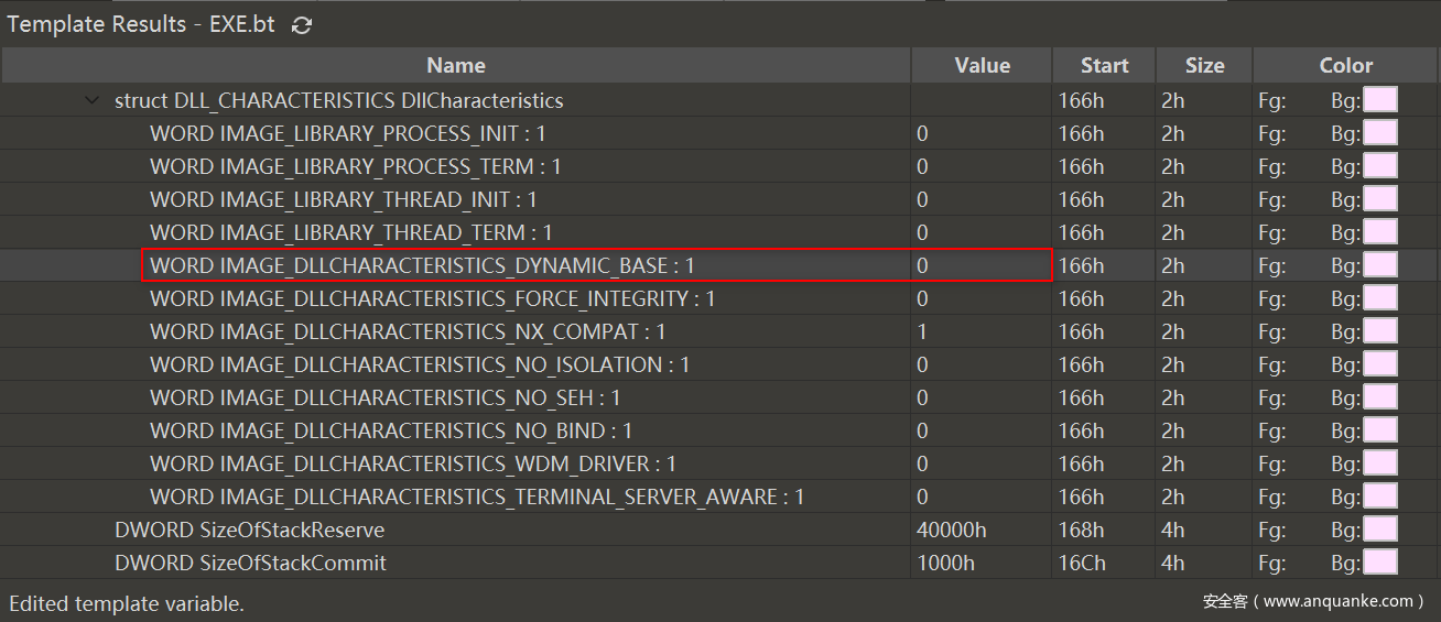 这样设置完后,你可能会发现,软件模块的加载基址仍然不是一个确定的值,这时,就需要使用16进制编辑器将PE文件头中的NT Headers->Optional Header->DllCharacteristics->IMAGEDLL_CHARACTERISTICS DYNAMIC_BASE设置为0,用其替换原有的软件模块。这样就彻底关闭了Internet Explorer的ASLR了。这里推荐使用010Editor,借助它的Templates功能,可以很方便的修改该标志位。
