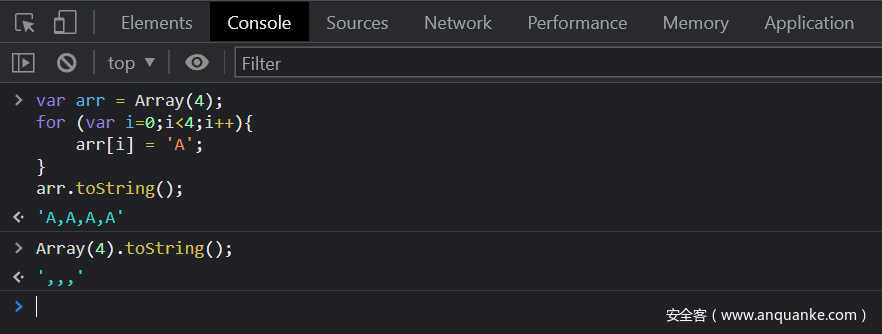 原始PoC中,并未将创建的Array数组初始化,我们通过Chrome的开发者工具查看未初始化的Array数组转化为字符串后,得到的是什么。这有助于我们后面在调试PoC时,观察字符串所对应的内存数据。