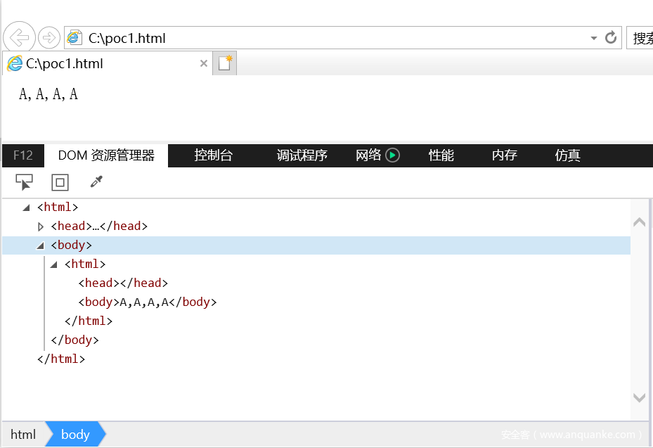 我们可以得出以下结论:PoC通过HTML DOM方法document.createElement(),创建了一个“html”结点(同时创建“head”和“body”结点),并把新创建的“html”结点添加到原有的“body”结点中。然后,创建了一个Array数组并进行了初始化。最后将该数组转化为字符串,通过HTML DOM的innerHTML属性,添加到新创建的“html”结点中的“body”结点中。