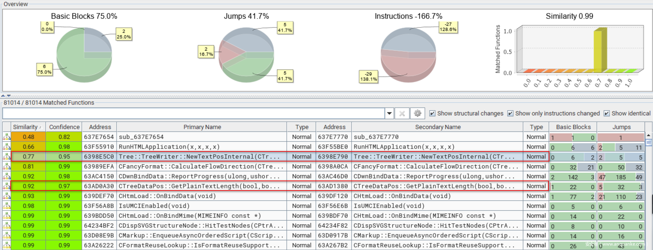 接下来我们将这两个补丁环境的mshtml.dll提取出来,使用IDA打开并生成IDB文件,再使用BinDiff进行补丁比较。不同的IDA版本和不同的BinDiff版本可能会出现不兼容的情况,我这里使用的是IDA Pro7.5+BinDiff6。分析完成后,得到如下结果: