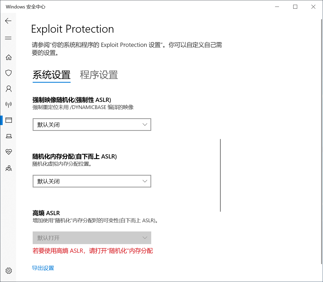 关闭了ASLR后,可以更方便的进行调试,dll模块的加载基址不会在每次调试时发生改变,造成调试障碍。Windows10是通过Windows Defender来关闭Windows缓解措施的。打开Windows Defender后,选择“应用和浏览器控制”,然后找到“Exploit Protection”,选择“Exploit Protection 设置”。注意:设置界面拥有两个选项卡,“系统设置”和“程序设置”。我们先看“系统设置”,与ASLR有关系的是“强制映像随机化(强制性ASLR)”、“随机化内存分配(自下而上ASLR)”、“高熵ASLR”,我们都将其设为关闭状态。先关闭“高熵ASLR”,然后再关闭其他两项。