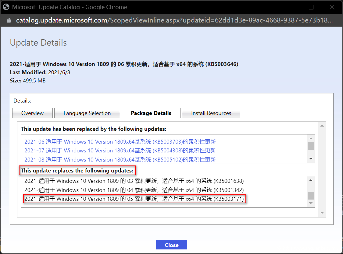 由于KB5003646补丁是2021年6月8日发布的一个累计更新,如果补丁分析时所用的两个漏洞模块文件是两个更新时间相差较大的环境提取出来的,会造成不好定位补丁位置。所以我们需要知道2021年5月发布的累计更新补丁编号。这可以通过KB5003646在Microsoft更新目录详情页面的信息得到。