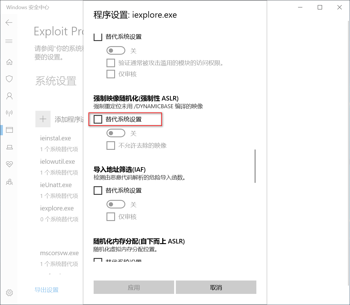 接下来,我们来看“程序设置”。由于Windows10可以对单独的应用程序设置缓解措施的开启或关闭,并且替换“系统设置”中的设置,造成关闭了“系统设置”中所有与ASLR相关的缓解措施后,dll模块的加载基址还是在变化。切换到“程序设置”选项卡后,找到iexplore.exe,点击编辑,将所有与ASLR有关的设置的“替代系统设置”的勾去掉。