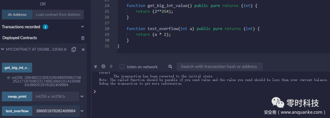 实测,程序会在运行时溢出。我们建议使用 SafeMath 库来解决漏洞溢出: