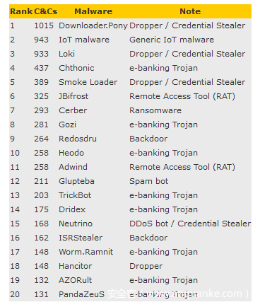 如下是报告中发布的前20大最常见的僵尸网络 C&C 服务器排名情况: