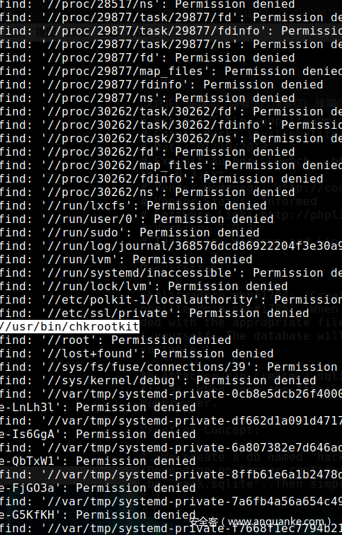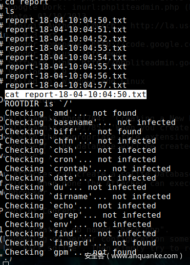 但是这个权限还算不够的,我们只能通过提权做进一步操作。大家肯定都直接想到脏牛提权了,但是本靶机没有这个漏洞,本菜在进行磁盘查看的时候,发现一个叫“/report”的文件夹,通过查看里面的文件发现是一个rootkit检测工具的实时报告文件,如图