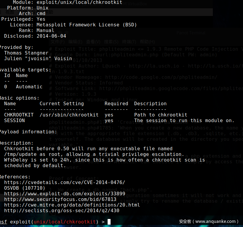 通过查看其版本号和配置信息结合google搜索,发现一个本地提权漏洞,而MSF也已经有该利用脚本,如图: