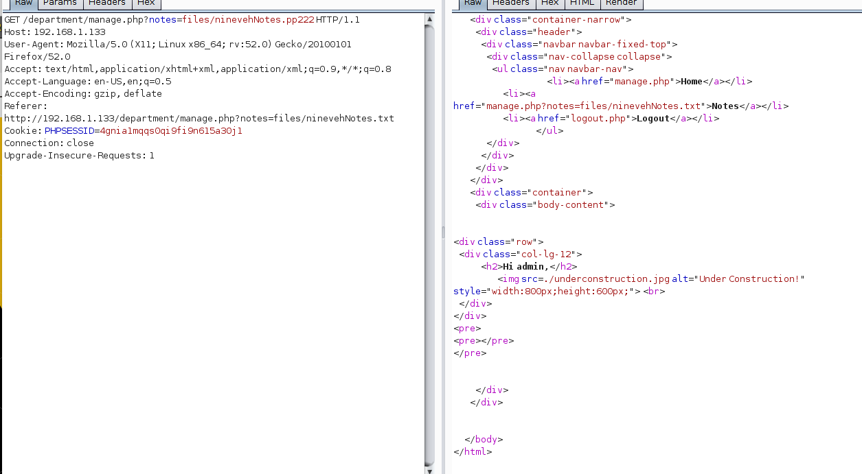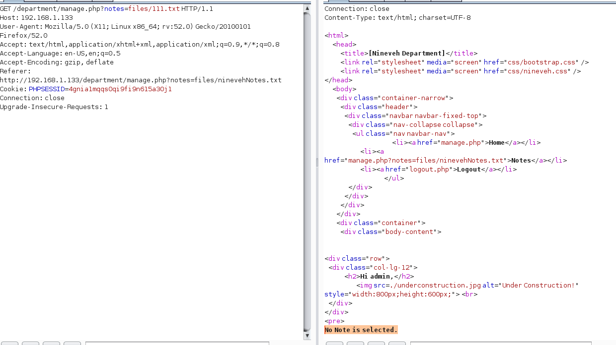 登录在http://192.168.1.51/department/manage.php?notes=files/ninevehNotes.txt 是一个简单任意文件读取,但是这里的读取文件是被写入白名单里的,就是它只能读取结尾带‘ninevehNotes’的文件,测试如图: