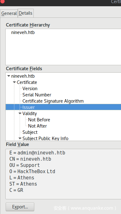 发现只开放了80、443 2个端口,我们访问443端口,老规矩看证书,里面肯定有包含特殊信息:“admin@nineveh.htb”,如图: