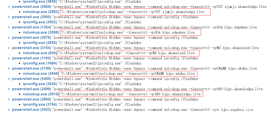 样本再通过本机的nslookup程序向相关域名提交请求,而由于这些域名的NS记录被指定为了攻击者的DNS服务器(tvs1.trafficmanager.live),故nslookup提交的查询信息会被发送给攻击者的DNS服务器,然后读取DNS服务器返回的信息进行数据交互。所以样本其实是在和攻击者控制的DNS服务器进行最终的通信。