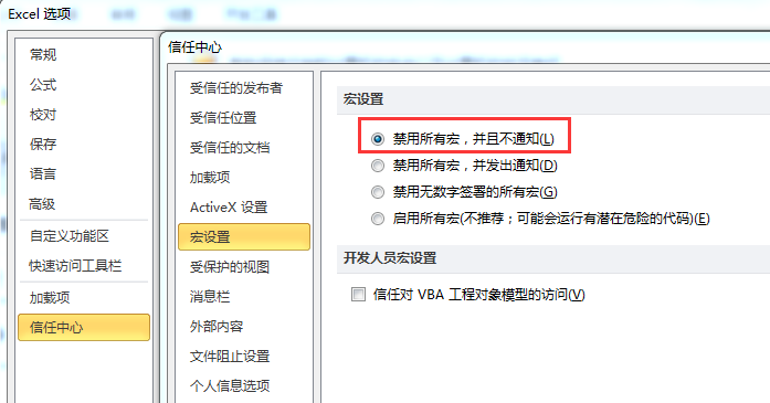 从近年来的高级攻击事件分析中可以看出,由于利用Office 0day等漏洞进行攻击的成本较高,多数攻击者更趋向于利用Office VBA宏执行恶意代码。企业用户应尽可能小心打开来源不明的文档,如有需要可通过打开Office文档中的:文件-选项-信任中心-信任中心设置-宏设置,来禁用一切宏代码执行: