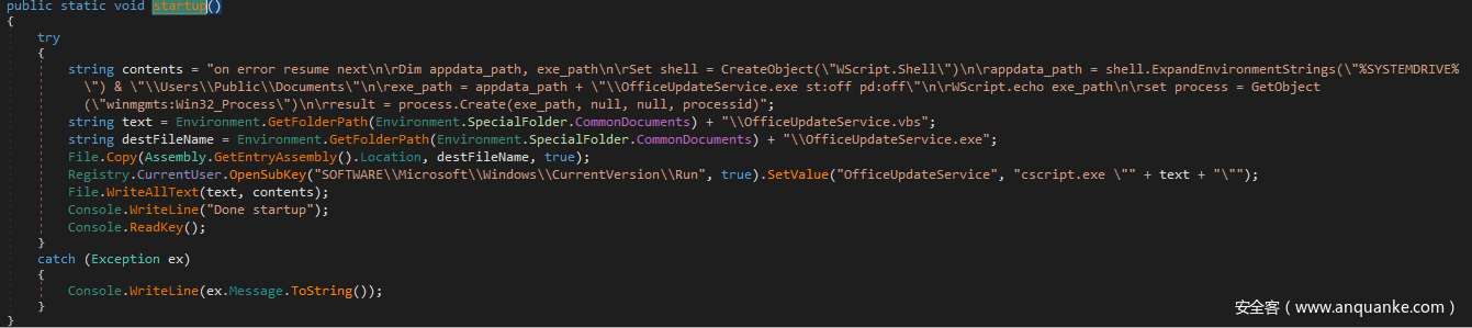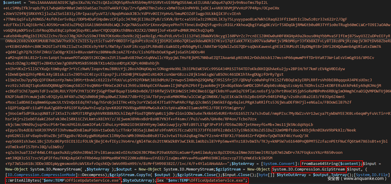 WINDOWSTEMP.ps1脚本内容如下,该PowerShell脚本使用Base64和gzip解码和解压缩脚本里的content,然后写入到文件:%TEMP%\\OfficeUpdateService.exe,最后运行%TEMP%\\OfficeUpdateService.exe: