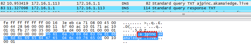 首先我们构造一个二级域名:ajpinc.akamaiedge.live,二级域名ajpinc中的a代表第一次请求,末尾的c代表结尾,a和c之间是编码过后的当前进程ID。然后我们使用nslookup发送该请求,执行的效果如下: