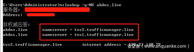 攻击者首先将相关域名的NS记录修改为了攻击者控制的DNS服务器,攻击者指定用于解析相关域名的NS服务器为:tvs1.trafficmanager.live , tvs2.trafficmanager.live,我们通过nslookup可以查询得到: