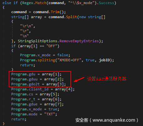 值得注意的是,^\\$x_mode指令将设置文件上传下载的服务器,服务器地址通过DNS隧道获取: