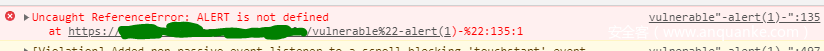 使用Burp Suite扫描之后,我们发现在URL结尾添加“-alert(1)-”(http://website.com/dir/subdir/”-alert(1)-”)将能够反射XSS,浏览器会告诉我们“unable to find function ALERT(1)”:
