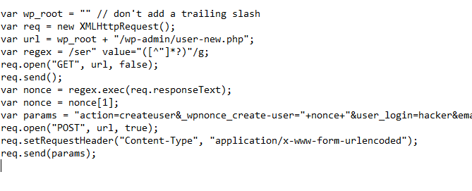 下图显示的是一个WordPress Payload,我们的目标是在目标网站中加载要一个外部JS文件,并修改账号密码以及邮箱:
