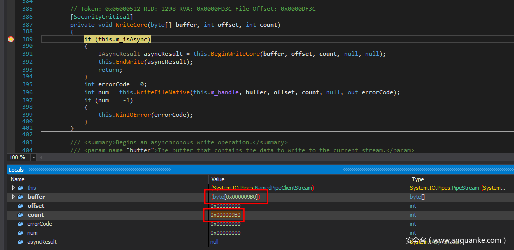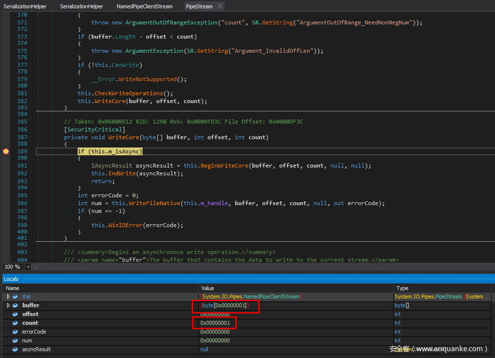 因此,为了测试是否可以使用恶意对象来反序列化,我们可以使用如下方法。首先,我们通过调试器(比如dnSpy)启动(而不是attach)TinyWall程序,在客户端向管道写入消息之前的位置上设置断点,这样我们就能修改序列化后的对象。在运行过程中,我们可以考虑在Windows System.Core.dll中的System.IO.PipeStream.writeCore()方法上设置断点,以便完成修改操作。完成这些设置后,很快断点就会被触发。