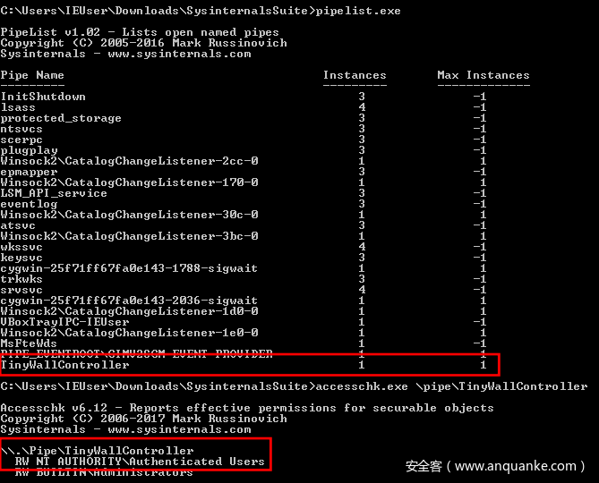 如下图所示,该产品用到了TinyWallController命名管道,并且任何已认证用户可以访问并写入该管道。