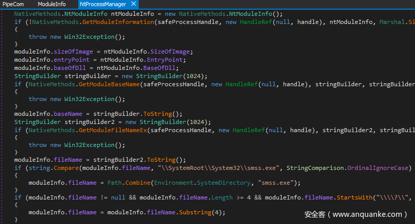 GetNamedPipeClientProcessId()这个Windows API用来获取特定命名管道的客户端进程标识符。在最终的PoC(Exploit.exe)中,我们的客户端进程必须通过某种方式伪造MainModule.FileName属性,以便匹配TinyWall的程序路径。该属性通过System.Diagnostics.ProcessModule的System.Diagnostics.ModuleInfo.FileName成员来获取,后者通过psapi.dll的GetModuleFileNameEx()原生调用来设置。这些调动位于System.Diagnostics.NtProcessManager上下文中,用来将.NET环境转换为Windows原生API环境。因此,我们需要研究一下是否可以控制该属性。