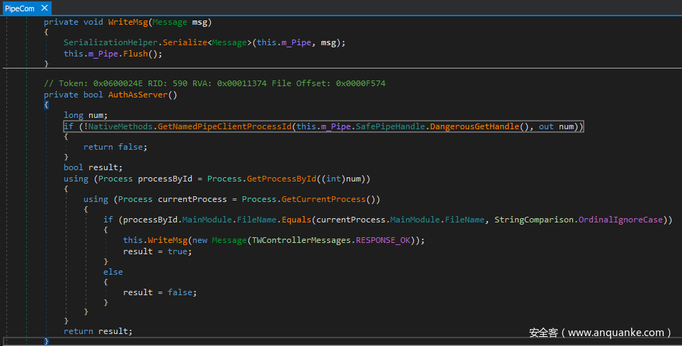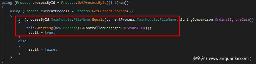 如果未能通过检查,则代码会抛出异常,内容为“Client authentication failed”(客户端认证失败)。跟踪代码流程后,我们找到了一个“认证检查”代码块,代码逻辑基于进程ID来检查,判断服务端与客户端进程的MainModule.FileName是否一致。开发者之所以使用这种逻辑,可能是想确保相同的、可信的TinyWall程序能通过命名管道来发送和接收封装好的消息。
