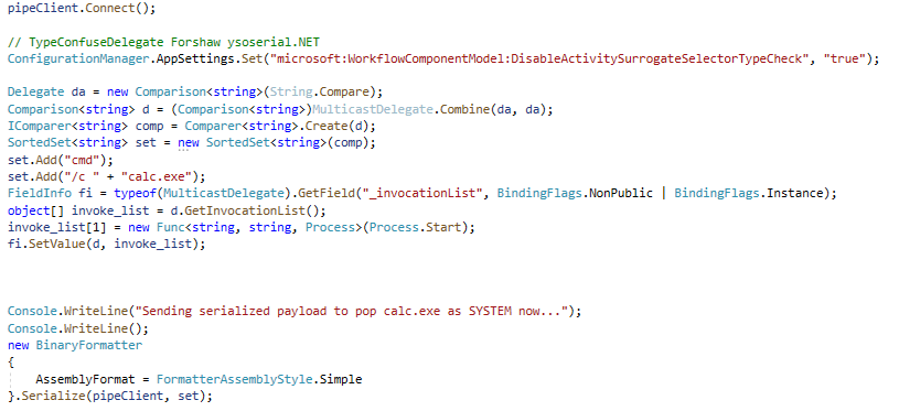 现在距离完整利用代码只差一步之遥,前面我们在Exploit.exe刚开始运行时调用James Forshaw的TypeConfuseDelegate代码以及Ruben Boonen的PowerShell脚本,现在我们可以进一步连接到TinyWallController命名管道。更具体一些,我们需要将System.IO.Pipes.NamedPipeClientStream变量pipeClient与弹出计算器的gadget一起传入BinaryFormatter.Serialize()。